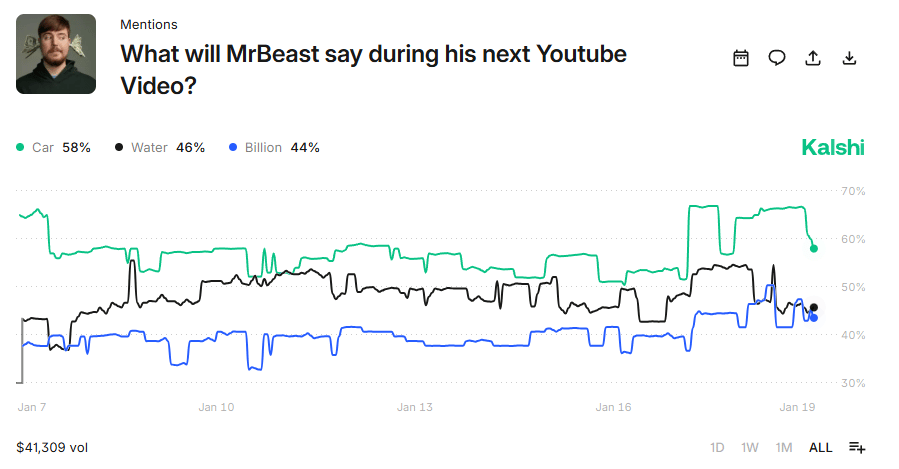 Prediction markets let you trade money on the probability of future outcomes. This includes betting, I mean “trading” real money on the likelihood of everyday and cultural events like “What will MrBeast say during his next YouTube Video?”